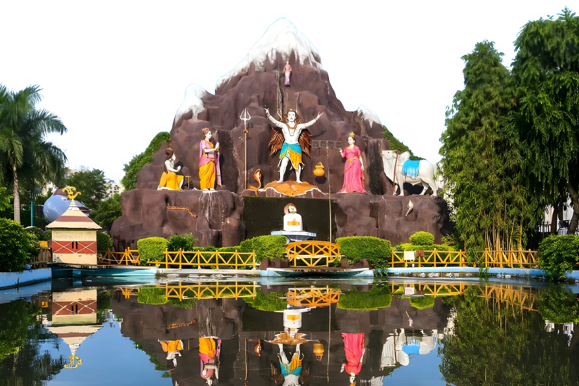 A divine peak where Shiva's essence manifests. This mountain symbolizes spiritual consciousness and touches the sky, representing the sacred memory of Mount Kailash. The grand statue of Lord Shiva with outstretched arms invites devotees, while water flowing from his matted hair enacts the sacred descent of the Ganga, providing purification and peace.